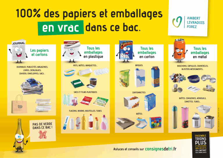 Les papiers et cartons, les briques alimentaires, les emballages en plastique (les bouteilles, les flacons, les pots et boîtes, les barquettes, les tubes, les films, les sacs et sachets, etc.) et les emballages en métal (les boites de conserves, les emballages métalliques, les gourdes de compote, les tubes, les capsules de café, les feuilles d’aluminium froissées, les opercules, les couvercles et capsules, les plaquettes de médicaments vidées, etc.) vont désormais dans les bacs jaunes.